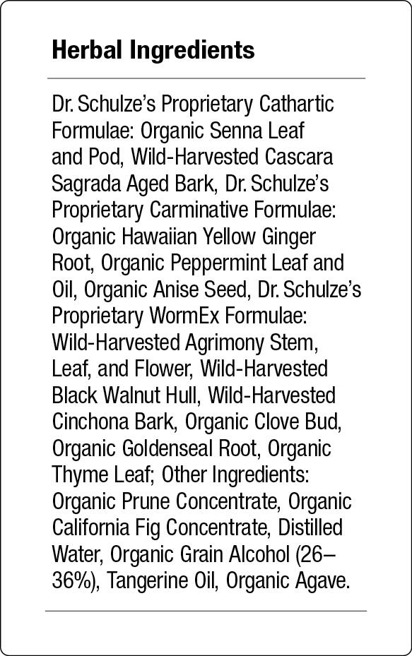 Other Ingredients: Organic Prune Concentrate, Organic California Fig Concentrate, Distilled water, Organic grain alcohol (26-36%), Tangerine oil, and Organic Agave